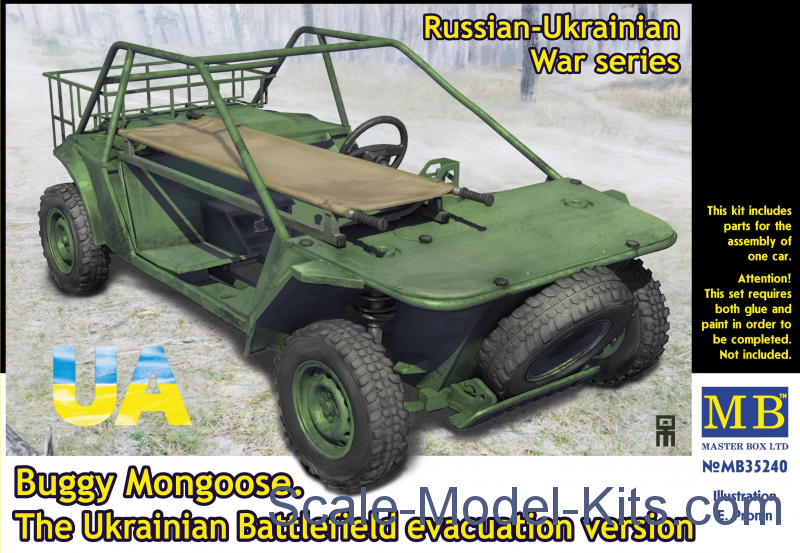 Buggy Mongoose. The Ukrainian Battlefield evacuation versionSKU: MB35240Manufacturer: Master Box Scale: 1:35 Price: $23.80 Plastic model kit in scale 1/35 Buggy Mongoose. The Ukrainian Battlefield evacuation version (Master Box No.35240) This set includes: